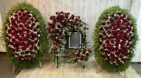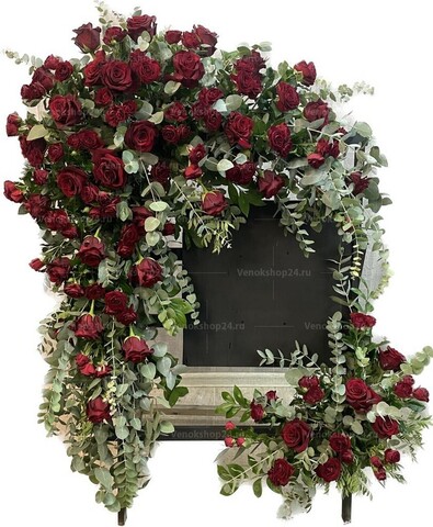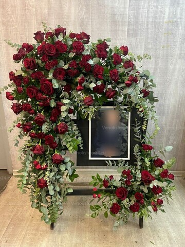 Эта траурная рама для портрета из живых цветов, с бордовыми розами, гипсофилой, эвкалиптом и зеленью, не только является прекрасным памятным украшением, но и символом уважения и долговечной памяти о тех, кого мы потеряли.