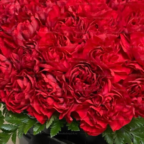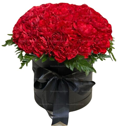 Траурная коробка с 50 красными гвоздиками в окружении зеленой листвы папоротника. Эта композиция олицетворяет скоротечность земного бытия и небесную бесконечность.