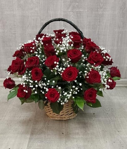 В плетеной ритуальной корзине из живых цветов с ручкой расположились 50 гранатово-красных роз в окружении белоснежных соцветий гипсофилы и сочной зелени листвы. Траурная торжественность композиции способна с почтением проводить в последний путь безвременно ушедшего близкого.
