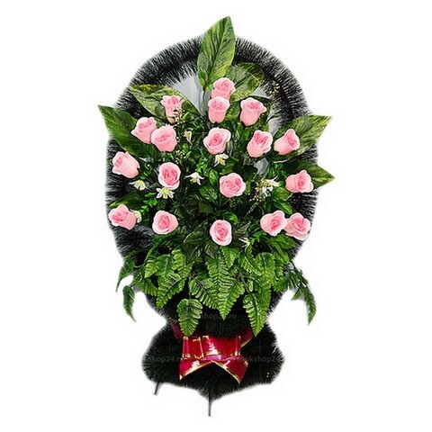Нежно-розовые бутоны роз утопают в пышной листве и олицетворяют нежную любовь. Цветы размещены в традиционной корзине из еловой гирлянды. Декоративная лента внизу изделия подчеркивает траурную торжественность композиции.
