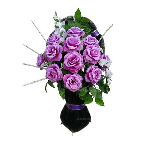 Корзина из еловой гирлянды с ручкой. Флора представлена крупными лиловыми розами и стрелами белого гладиолуса. Эти цветы символизируют духовную чистоту и сострадание. Декоративная фиолетовая лента усиливает траурное настроение композиции.