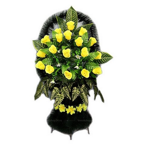 Корзина из искусственных цветов из еловой гирлянды с ручкой. Флористическое наполнение представлено лимонного оттенка бутонами роз. Они символизируют всепобеждающий солнечный свет. Канареечно-желтые цветы трогательно разместились в основании изделия.