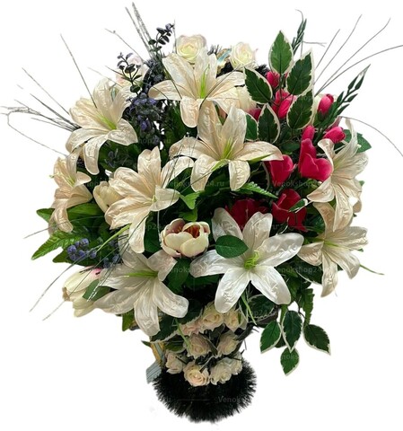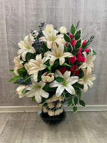 В этой ритуальной корзине присутствуют крупные бутоны белых лилий, символизирующих чистоту и невинность. Они создают атмосферу спокойствия и утешения. Кроме того, в композицию добавлены розовые и белые тюльпаны, которые приносят ощущение нежности и любви. Также добавлены веточки других цветов и зелень, чтобы добавить еще больше текстуры и гармонии. Траурная корзина из искусственных цветов – это особый способ сохранить красоту и свежесть цветов на долгое время. Она станет достойным выражением вашей скорби и уважения по случаю потери близкого человека. |