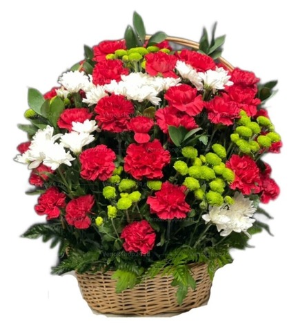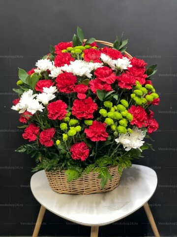 Траурная корзина из живых цветов состоит из красных гвоздик, белых и зеленых хризантем и зелени. Красные гвоздики вносят нотки печали и скорби, выражая глубокий траур и уважение к ушедшему. Белые хризантемы символизируют небесность, приносят утешение и скорбь. Зеленые хризантемы добавляют нотку свежести и жизненности, напоминая о вечном цикле жизни. Эта траурная корзина идеально подходит для выражения вашего горя по утрате близкого человека.