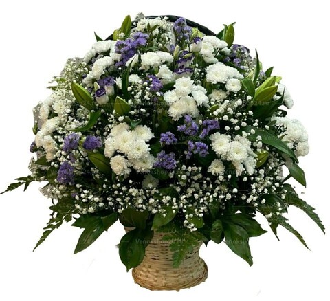 Ритуальная корзина изящно украшена белоснежными живыми лилиями, хризантемами и синими цветами статицы, создавая неповторимую атмосферу торжественности и уважения. Каждый цветок тщательно подобран и укладывается с любовью, чтобы передать глубокие чувства и уважение к ушедшему. Эта изысканная композиция станет достойным символом прощания и памяти о близком человеке.