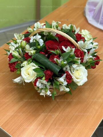 Изысканное сочетание винно-красных и алебастровых роз, кустовых гвоздик цвета маджента и бело-розовых альстромерий на фоне темно-зеленой листвы. Корзина на похороны станет выражением чувств нежной любви к усопшему. Цветы располагаются в плетеной корзине с ручкой.