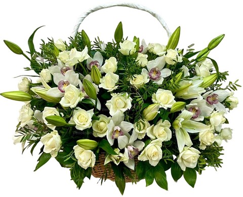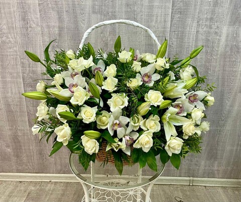 Корзина из белых живых цветов - станет символом уважения и прекрасной данью памяти.