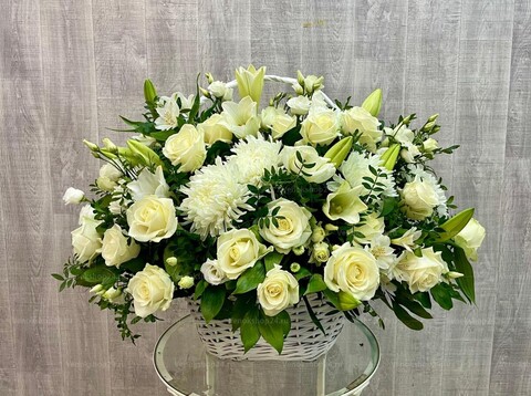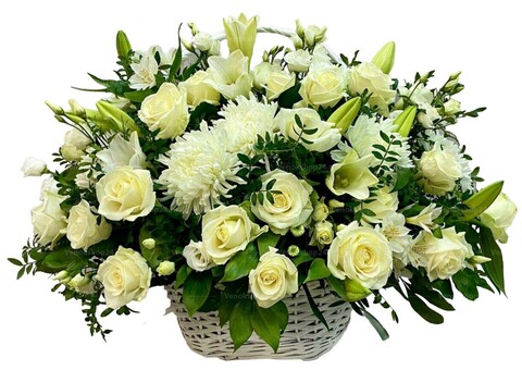 Корзина из белых живых цветов - станет символом уважения и прекрасной данью памяти.