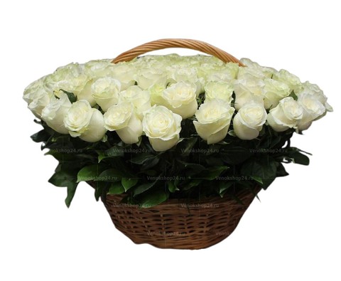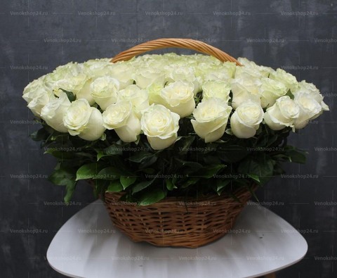 Корзина с живыми цветами с 200 бутонами кипенно-белой эквадорской розы. Эта лаконичная траурная композиция символизирует нетленную вечность и чистоту.