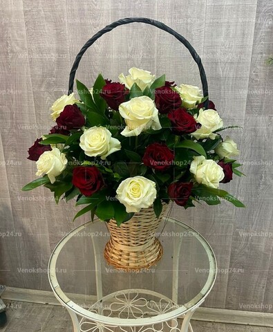 Траурная корзина из живых цветов с 40 алыми и кремовыми розами в окружении сочной зелени. Цветочная композиция способна выразить уважение к усопшему и с достоинством проводить его в последний путь.