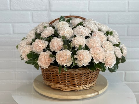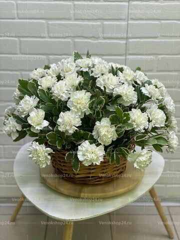50 кипенно-белых пышных гвоздик разместились в корзине-плетенке с ручкой. Траурную белизну цветов контрастно подчеркивает темно-зеленая листва. Траурная корзина из гвоздик символизирует скорбь и смирение, а также чистоту и безгрешность.