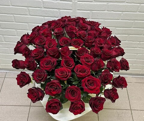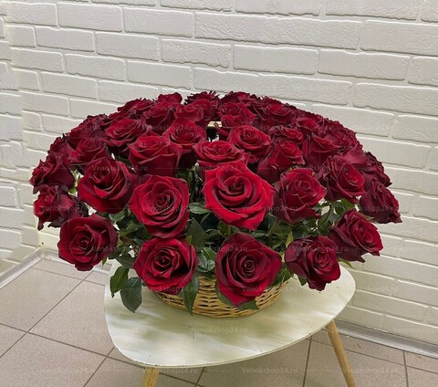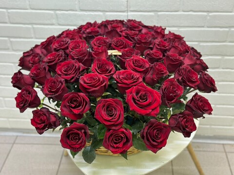 Корзина с живыми цветами с 50 бутонами рубиново-красных эквадорских роз. Эта траурная композиция олицетворяет чувства скорби и смирения.