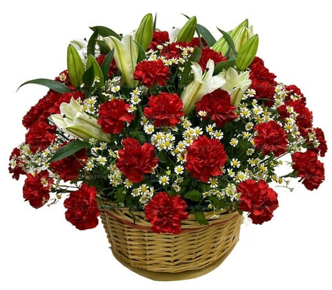 Состав: Гвоздика красная 50шт, лилия 6шт, ромашка 20шт.