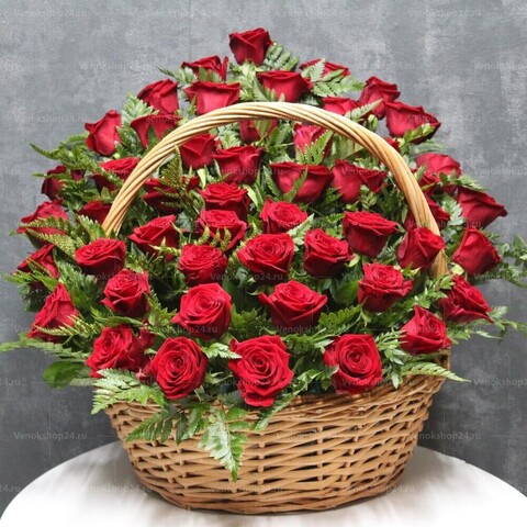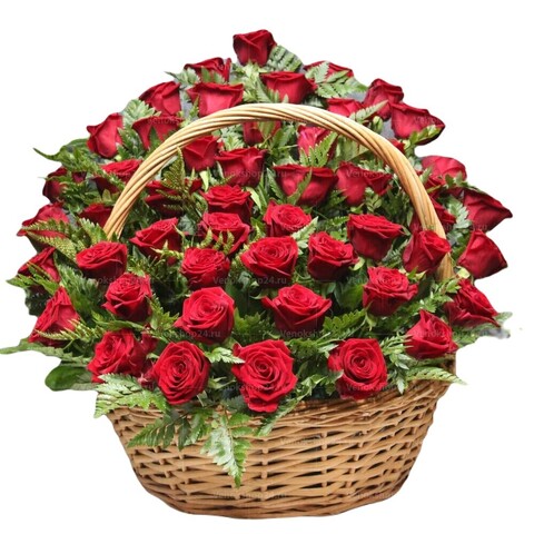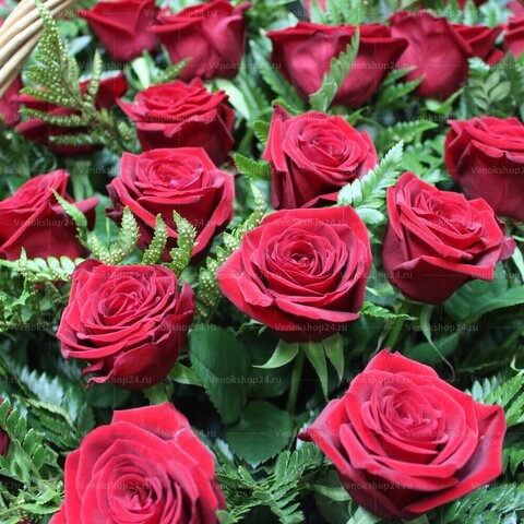 Каждая красная роза в этой корзине - это отдельный символ любви и уважения, который подчеркивает значимость ушедшего в жизни тех, кто его любил. Папоротник, с его изящным листьям и загадочным обликом, придает этой корзине особую глубину и эмоциональность.