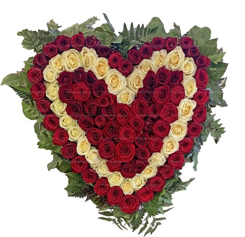 Венок из живых цветов в форме сердца способна без слов выразить скорбящим подлинную любовь и сострадание к усопшему. Фон выложен винно-красными бутонами роз. Ряд кремовых бутонов образует контур внутреннего сердца. Обрамляет композицию натуральная зелень.