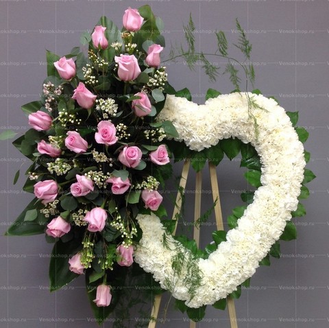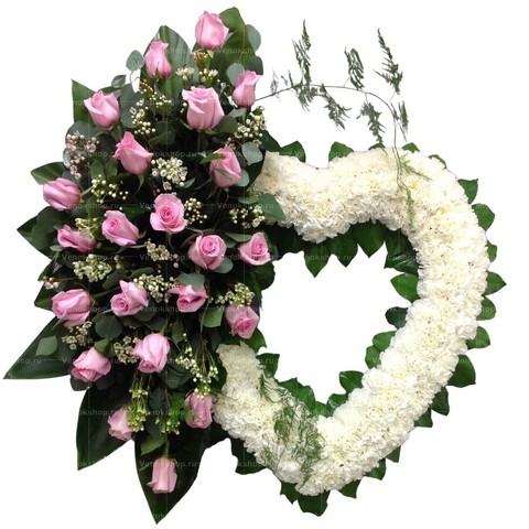 Траурный венок в виде сердца. Основу, составленную из белых гвоздик, дополняет композиция светло-розовых бутонов роз, утопающих в зеленой листве. Эти цветы, полные нежности и трепета, способны выразить самые теплые чувства подлинной любви и сострадания к покойному и с достоинством проводить его последний путь.