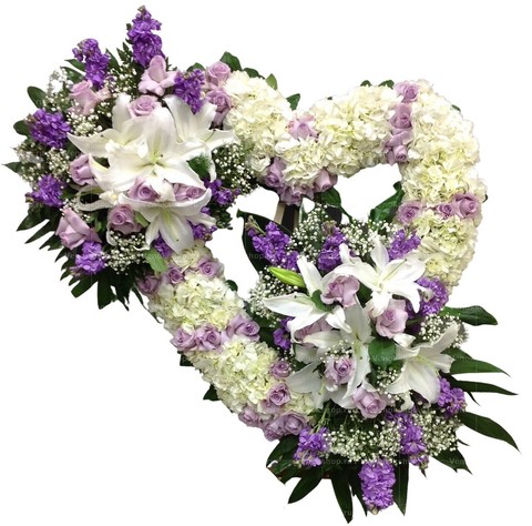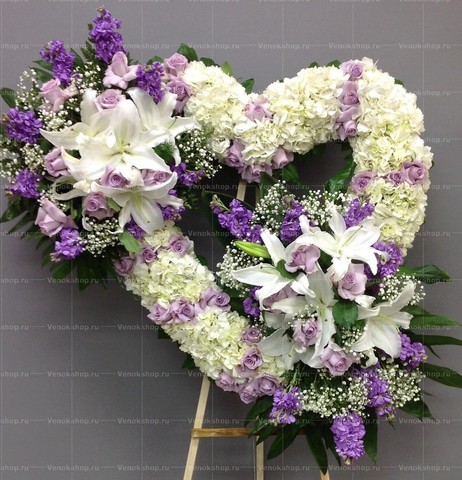 Венок из живых цветов на похороны в форме сердца из живых цветов в бело-сиреневой гамме. Флора представлена гортензиями с лепестками молочного оттенка, белоснежными лилиями и светло-лиловыми розами. Эти цветы, олицетворяющие чистоту души, невинность и сострадание, дополняет зеленая листва.