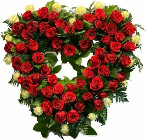 Траурная композиция на похороны в виде сердца из живых цветов. Контур символа любви выложен рубиново-алыми и кремового окраса розами на фоне пышной зелени. Эти цветы, полные символизма, способны выразить самые теплые чувства любви и уважения к покойному, достойно проводить его в последний путь.