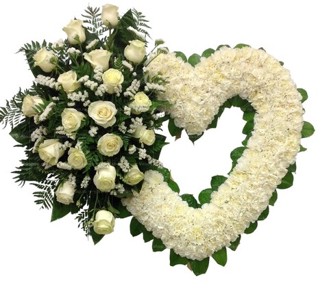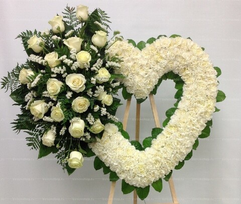 Траурный венок из живых цветов в виде сердца в монохромном белом исполнении. Сдержанная гамма цветов оттенков белого олицетворяет смирение, чистоту надежду. Флора представлена молочного оттенка гвоздиками и бледно-пудровыми бутонами роз. Белизну цветов выигрышно подчеркивает свежая зелень листвы.