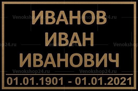 Универсальная табличка на могилу в минималистичном исполнении, подходит для любых конфессий. Строгий дизайн: золотые буквы на черном фоне. Крупное написание фамилии, имени, отчества. Формат годов жизни: месяц указывается римскими цифрами, день и год — арабскими. Размер: 30х20 см. Устойчива к влаге и выгоранию на солнце. Крепится к кресту или памятнику на шурупы.