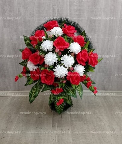 Траурная корзина из искусственных цветов в красно-белой гамме символизирует дуализм жизни и смерти. Белоснежные гвоздики контрастно сочетаются с рубиново-красными розами и алыми соцветиями дельфиниума. Сочная зелень листвы дополняет цветы, которые разместились в корзине из еловой гирлянды.