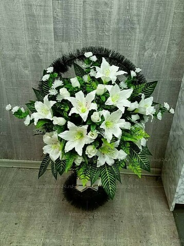 Траурная корзина из искусственных цветов представляет собой сочетание алебастровых лилий и кипенно-белых бутонов роз на фоне темно-зеленой листвы. Цветы расположились в корзине с ручкой, выполненной из хвои. Белая гамма цветов олицетворяет чувства скорби и смирения, а также символизирует вечность и чистоту души.