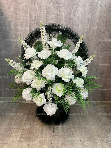Траурная корзина из искусственных цветов обвита еловой гирляндой. Флористическое наполнение выполнено в монохромном белом исполнении. Цветы представлены гладиолусами, розами и гвоздиками. Эта изящная композиция способна выразить чувства сострадания и светлой любви к покойному.