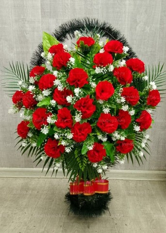 Россыпь ярко-алых роз в траурной корзине из хвои. Траурная корзина из искусственных цветов в классической красной гамме станет достойным жестом прощания и продемонстрирует уважение и любовь к усопшему, а также станет символом вечной памяти в сердцах скорбящих.