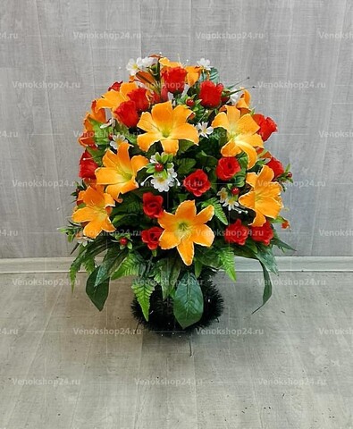 Траурная корзина из искусственных цветов в огненной гамме расположилась корзине, выложенной хвойной гирляндой. Оранжевые лилии в сочетании с алыми тюльпанами и декоративными ягодами гранатового оттенка способны выразить самые теплые чувства к усопшему.