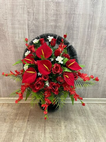 Траурная корзина из искусственных цветов в монохромном красном исполнении олицетворяет боль потери и вечную память об усопших. Алые розы, рубиновые гвоздики, гранатовые соцветия гладиолусов и крупные шарлаховые антуриумы расположились в корзине из темно-зеленой хвои.