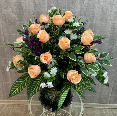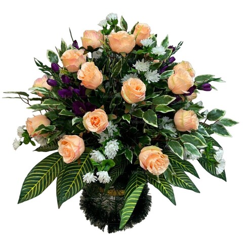 Траурная корзина, собранная из изысканных кремовых бутонов роз, нежных белых хризантем и зелени будет идеальным выбором для выражения вашей скорби и уважения к ушедшему близкому человеку. Белые хризантемы символизируют чистоту и бессмертие души. Их нежные лепестки создают ощущение спокойствия и умиротворения, что позволяет почтить память ушедшего и в то же время выразить свои глубокие чувства. Кремовые бутоны роз добавляют изысканности и элегантности композиции. Они символизируют благородство и прекрасный вкус. Эти красивые цветы помогут создать атмосферу достоинства и возвышенности на траурной церемонии. Зелень, использованная в композиции, добавляет свежести и живости. Она служит фоном, подчеркивая красоту цветов и придающая композиции естественность и гармонию. Траурная корзина из кремовых бутонов роз, белых хризантем и зелени - это идеальный выбор, чтобы выразить свои искренние соболезнования и показать, что вы помните и цените ушедшего.