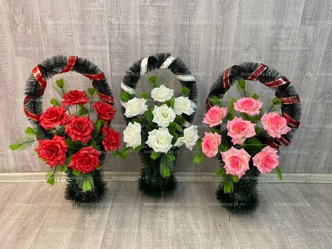 Траурная корзина из елового лапника с ручкой. Флористическое наполнение представлено розами лососевого и гранатового оттенка. Эти цветы способны выразить чувства любви и почтения, а также с достоинством проводить в последний путь. Декоративная лента довершает композицию. Купить корзину с искусственными цветами с доставкой можно через сайт или позвонив на бесплатный номер.