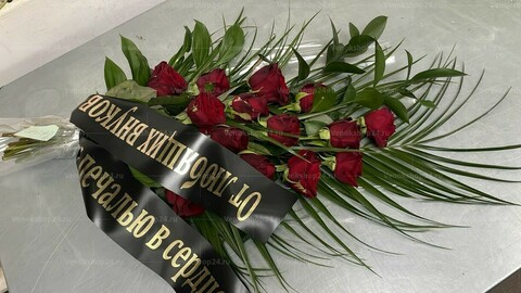 Букет на похороны из 16 бутонов багряно-алых роз. Эти цветы символизируют вечную память об усопших и милосердие. Фоновая зелень папоротника олицетворяет нетленную силу жизни.