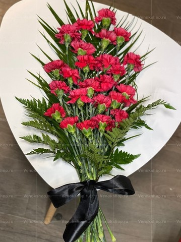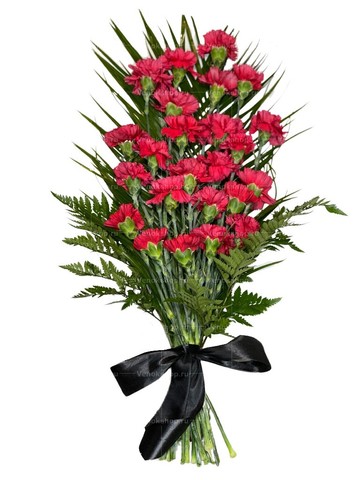 Ритуальный букет из 24 гвоздик карминово-красного оттенка. Траурный букет из гвоздик, дополняет изумрудная зелень папоротника.
