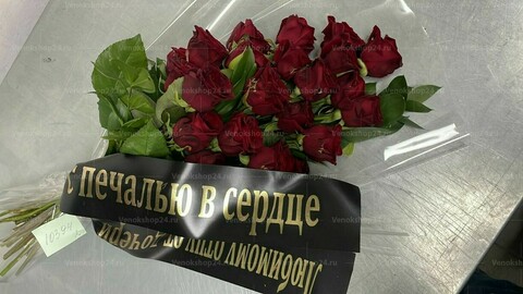 Траурный букет из живых цветов состоит из 24 роз бордово-винного оттенка. Этот букет выразит чувства скорби, а также продемонстрирует любовь и уважение к покойному.