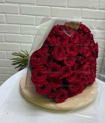 Цветы на похороны в виде букета из 50 роз бордово-винного оттенка. Композиция способна выразить траурные чувства скорбящего и продемонстрировать уважение к покойному.