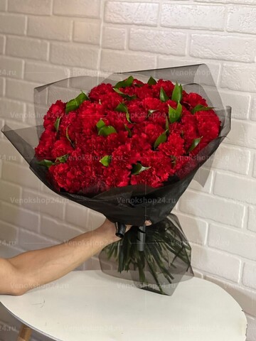 Основу траурной флористической композиции составляют карминового оттенка гвоздики. Цветы дополняет малахитовая зелень листьев и декоративная черная органза. Этот букет символизирует скорбь, сострадание.