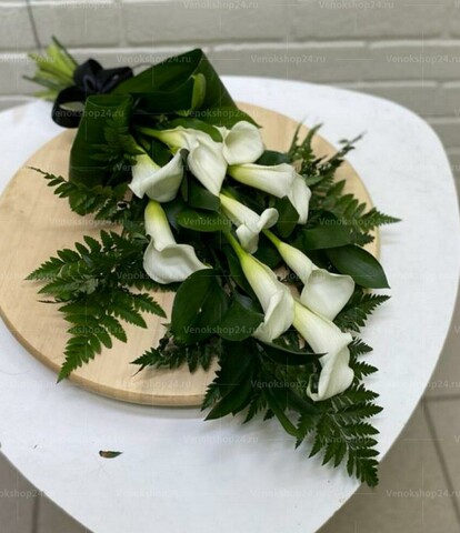 Алебастрового оттенка крупные каллы на фоне изумрудной зелени собраны в траурный букет. Эти белые цветы способны выразить глубокое уважение к покойному.