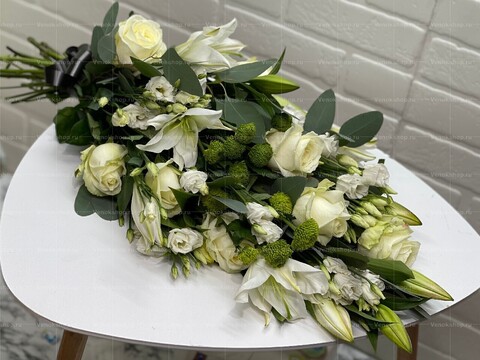 Траурный букет из цветов белых оттенков способен выразить самые светлые чувства любви и сострадания. Бледно-пудровые розы, лилии с молочными лепестками, белоснежные эустомы и зеленые миниатюрные хризантемы гармонично сочетаются с светло-нефритовой листвой эвкалипта.