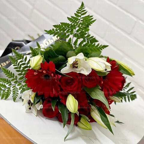 Оригинальная композиция траурного букета в красно-белой гамме. Алые герберы сочетаются с бордовыми розами и молочными бутонами лилий в окружении зелени папоротника. Эти цветы способны выразить уважение к усопшему и достойно проводить его в последний путь.