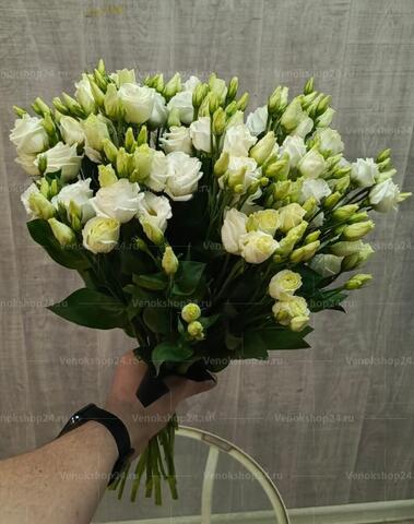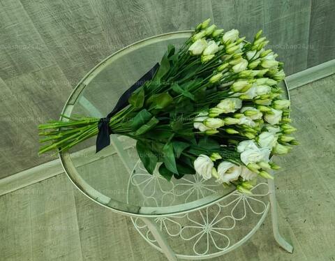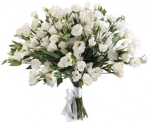 Ритуальный букет составлен из изящных белоснежных эустом. Эта флористическая композиция олицетворяет небесный свет и бесконечность.