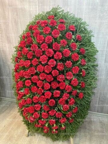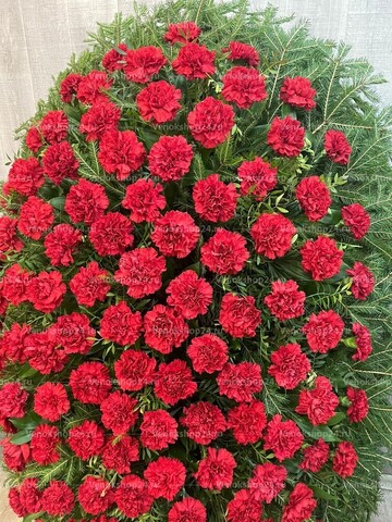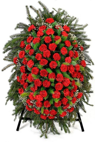 Композиция траурного венка из живых цветов представляет собой россыпь алых гвоздик на фоне хвойных веточек. Деликатные соцветия белой гипсофилы дополняют цветы. Классические красные гвоздики символизируют вечную память об умерших.