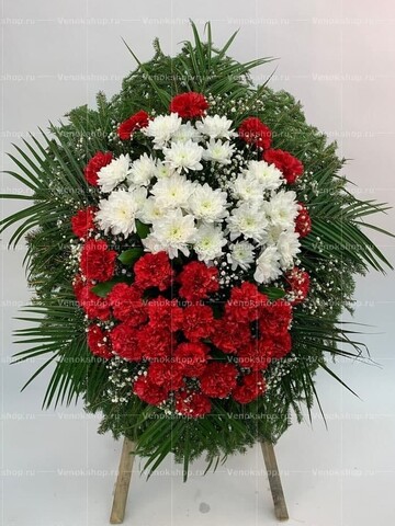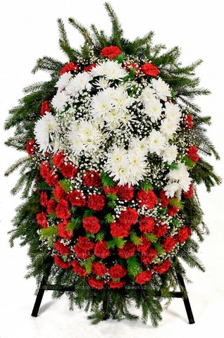 Основа венка — натуральная хвоя. В верхней части разместились белые хризантемы. Их дополняют ряды алых гвоздик и вкрапления веточек белоснежной гипсофилы. Композиционное решение олицетворяет веру в победу вечности над смертью.