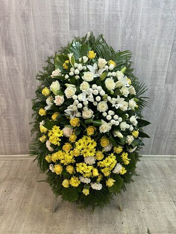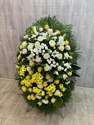 Траурный венок собран из белых и желтых бутонов роз, символизирующих чистоту и вечную любовь, и мелких цветов хризантем, которые являются символом скорби и честности. А также в композицию добавлены белоснежные лилии, которые символизируют чистоту и невинность. Фоном ритуальной композиции служит натуральная хвоя, папоротник и пальмовые листья, что придаёт ей пышность и благородный вид. Этот траурный венок станет достойным проявлением почтения и уважения к памяти ушедшего. Выразит глубокие чувства уважения, скорби и любви к ушедшему.