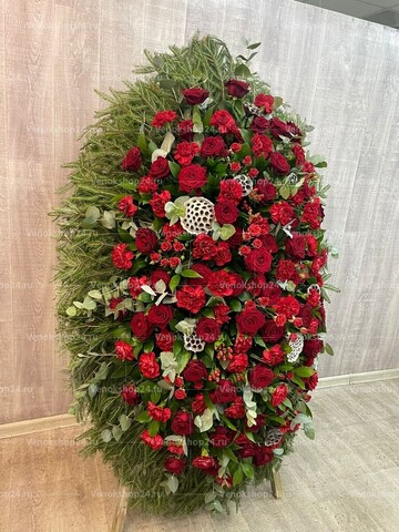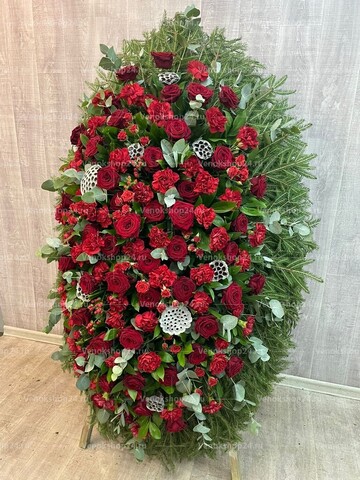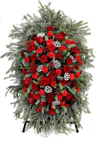 Оригинальный дизайн траурного венка построен на гармоничном сочетании коралловых гвоздик и бордово-красных роз. Контраст цветам составляют серебристо-зеленые хвойные ветви и декор в виде рубиновых гроздьев ягод и семенных коробочек лотоса. Композиция символизирует цикличность жизни и смерти.