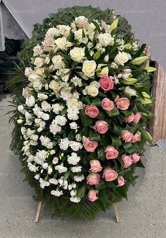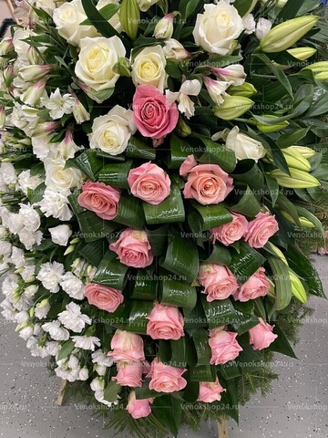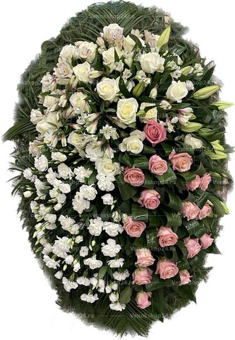 Композиция из живых цветов сочетает в себе бутоны белых и нежно-розовых роз, белоснежных гвоздик и эустом. Фоном венка служит вечнозелёная хвоя. Белые гвоздики и эустомы олицетворяют чистоту души и вечность. Нежно-розовые бутоны роз служат символом уважения и благодарности к ушедшему. Этот траурный венок из живых цветов является прекрасным и трогательным проявлением ваших чувств и памяти о близком человеке.