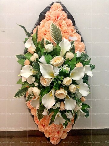 В центральной части венка из искусственных цветов располагается композиция из белоснежных калл, кремовых чайных роз и насыщенных зеленых листьев. Фоном выложены нежно-персиковые гвоздики. Эта композиция символизирует непорочную душу и подлинное смирение.