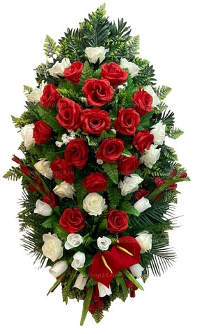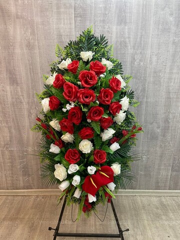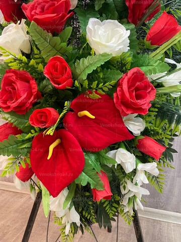 Венок авторский поможет выразить горечь вашей утраты. Пышная композиция из бело-красных цветов подчеркнет значимость и важность усопшего в жизни скорбящих.