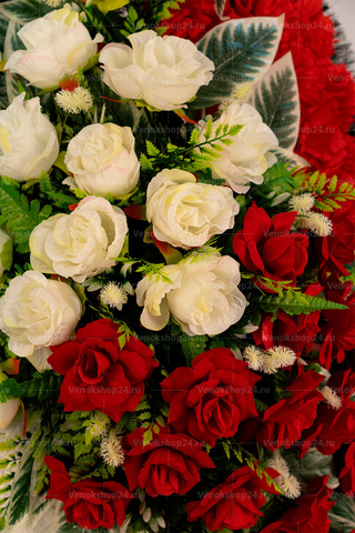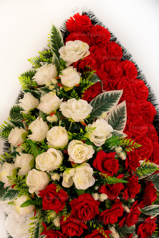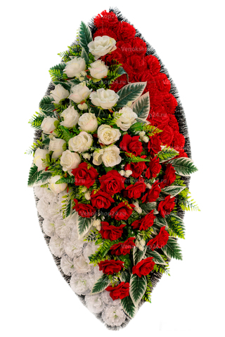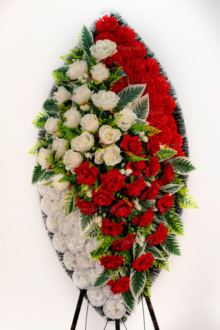 Оригинальный дизайн композиции представляет собой контрастное сочетание секторов молочных бутонов и пышных гранатовых роз. Эти цветы оформлены крупными листьями и веточками белой гипсофилы. Контраст роз поддерживают сектора белоснежных и алых гвоздик. Красно-белая гамма этого венка символизирует двойственность жизни и смерти, бренности и вечности.