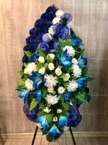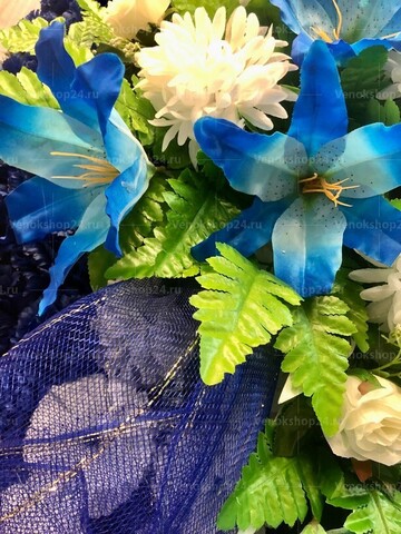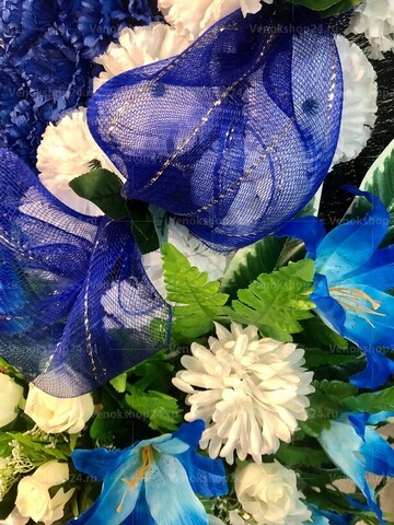 Цветочная композиция в сине-белой гамме. Белоснежные хризантемы, сливочные розы и лазурные лилии с белыми прожилками оттеняет зелень папоротника и салала. Белые гвоздики и оттенка индиго дополняют композицию. В качестве декора выступает синяя с золотом сетка. венок из искусственных цветов выразит скорбь и боль от потери близкого человека.